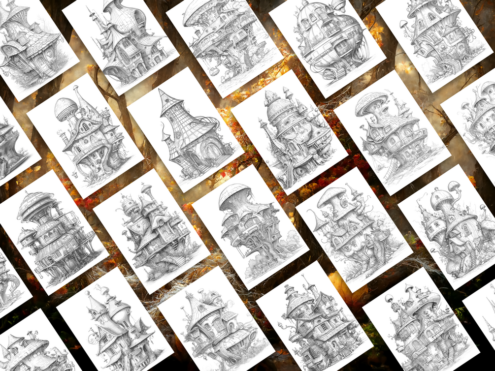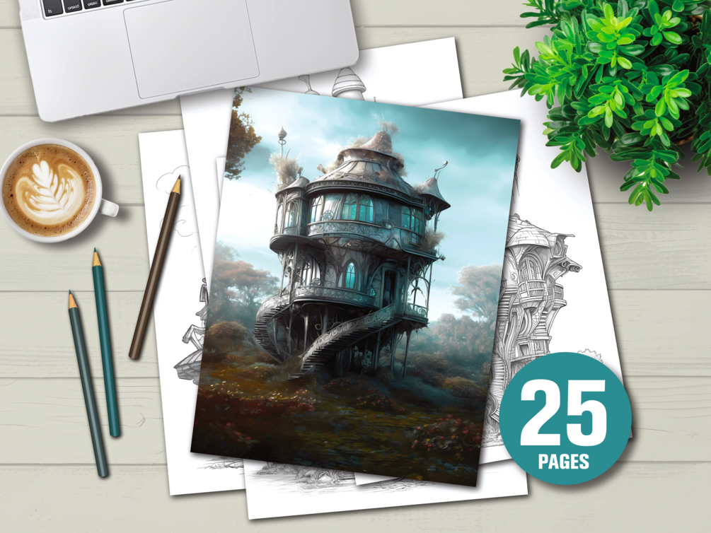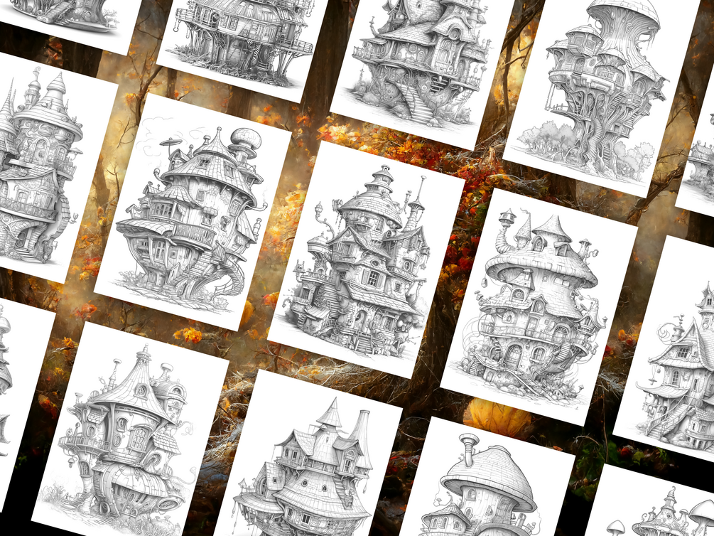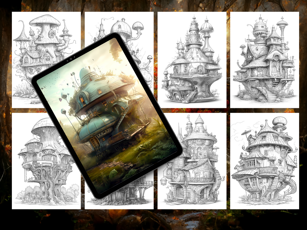 Inside, you’ll find 25 unique grayscale illustrations of quirky, imaginative fairy homes — ready for you or your kids to color and make your own. Each design has beautiful shading already added, so your finished pages will look stunning with less effort.