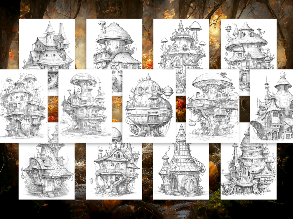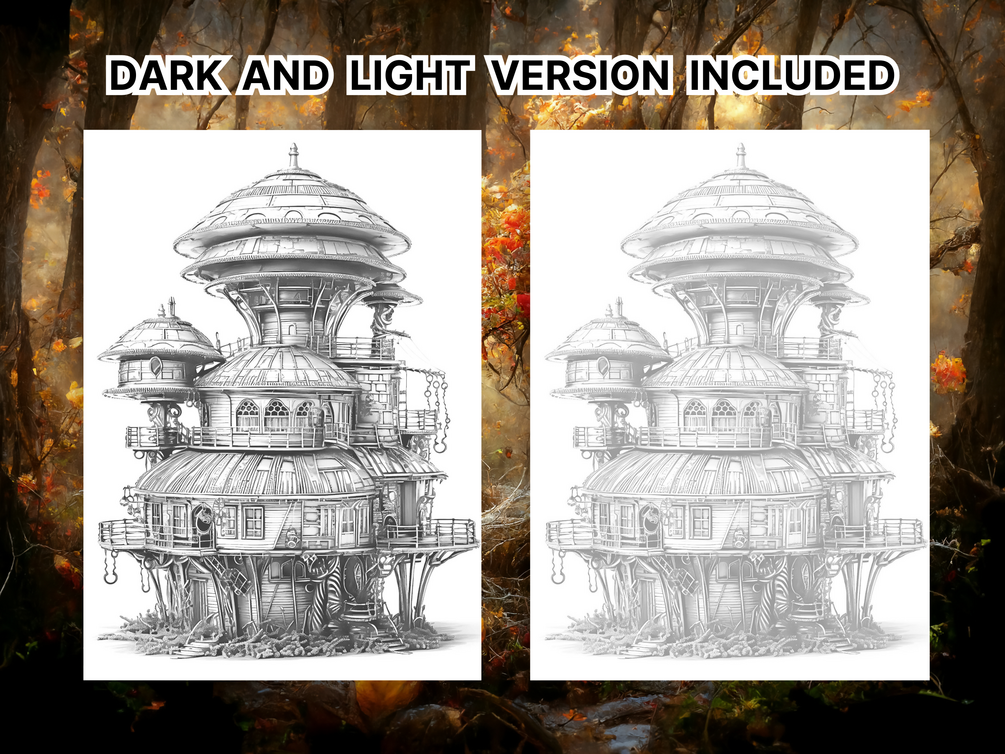 Discover 25 beautifully designed futuristic fairy house coloring pages in this printable grayscale coloring book for adults and kids. Instantly download, print at home, and enjoy hours of relaxing, creative fun with two shading versions and bonus inspiration pages included.
