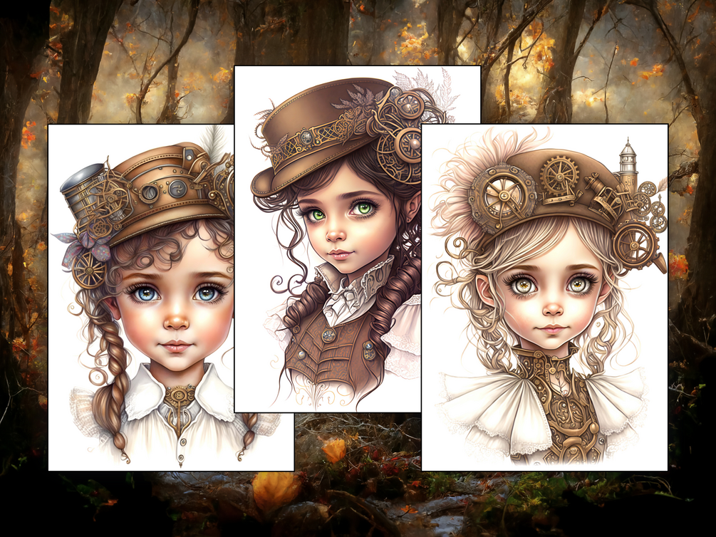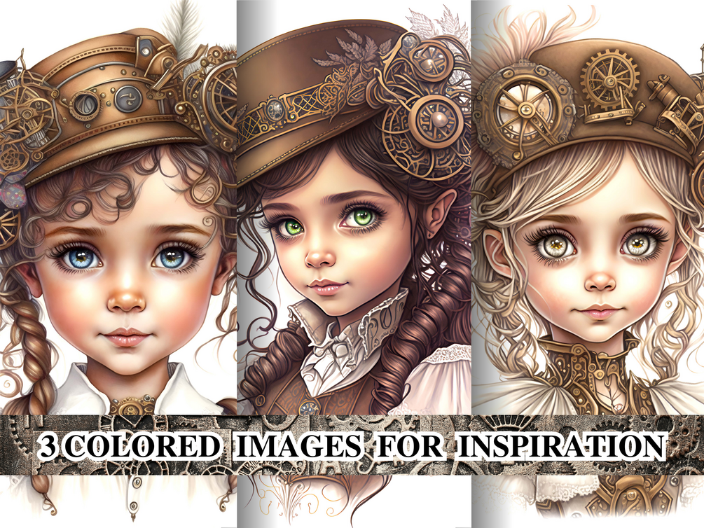 🎨 Bonus inspiration pages — 3 pre-colored steampunk girls to spark your creativity