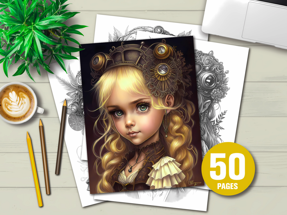 ✨ Steampunk Girls Coloring Book — 50 Printable Retro-Futuristic Pages for Teens & Adults, Instant Download ✨