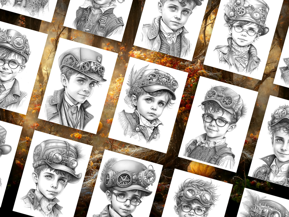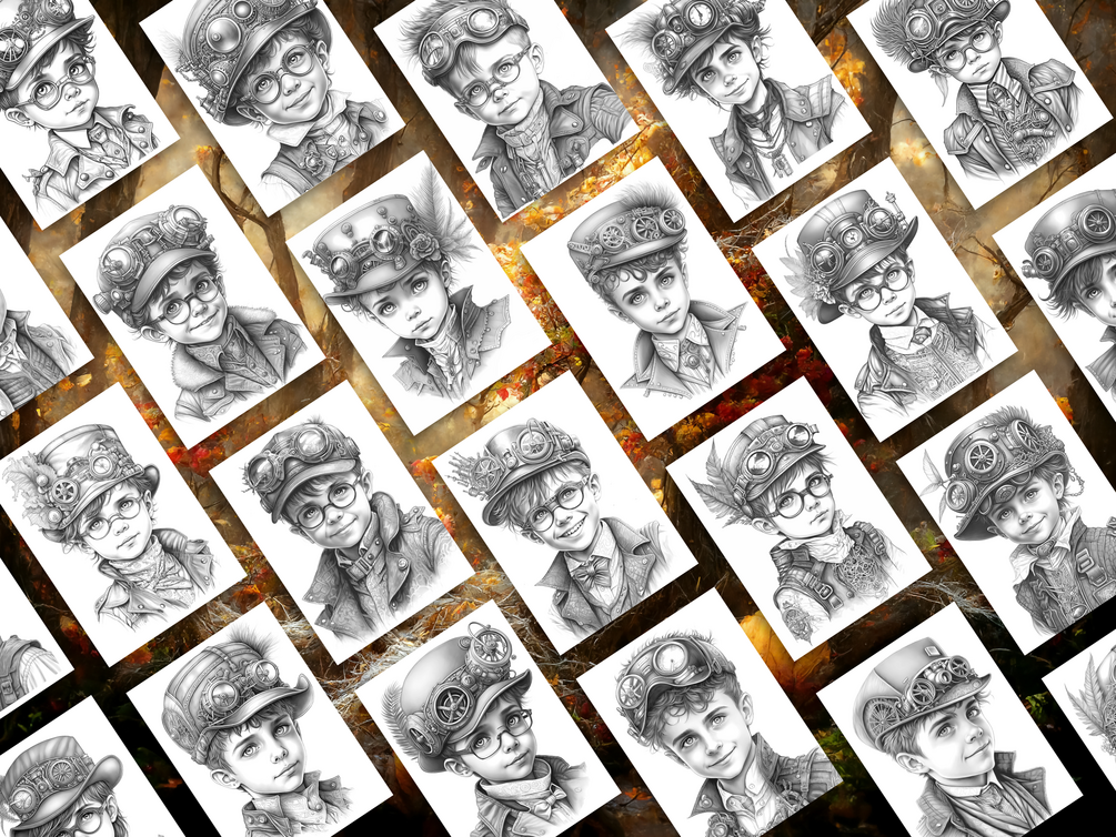 Step into a world of gears, goggles, and adventure with this Steampunk Boys Coloring Book! Inside, you’ll find 25 unique grayscale illustrations of daring steampunk boys in vintage outfits with mechanical details — perfect for kids, teens, or adults who love retro-futuristic fantasy. Download, print, and color at your convenience!