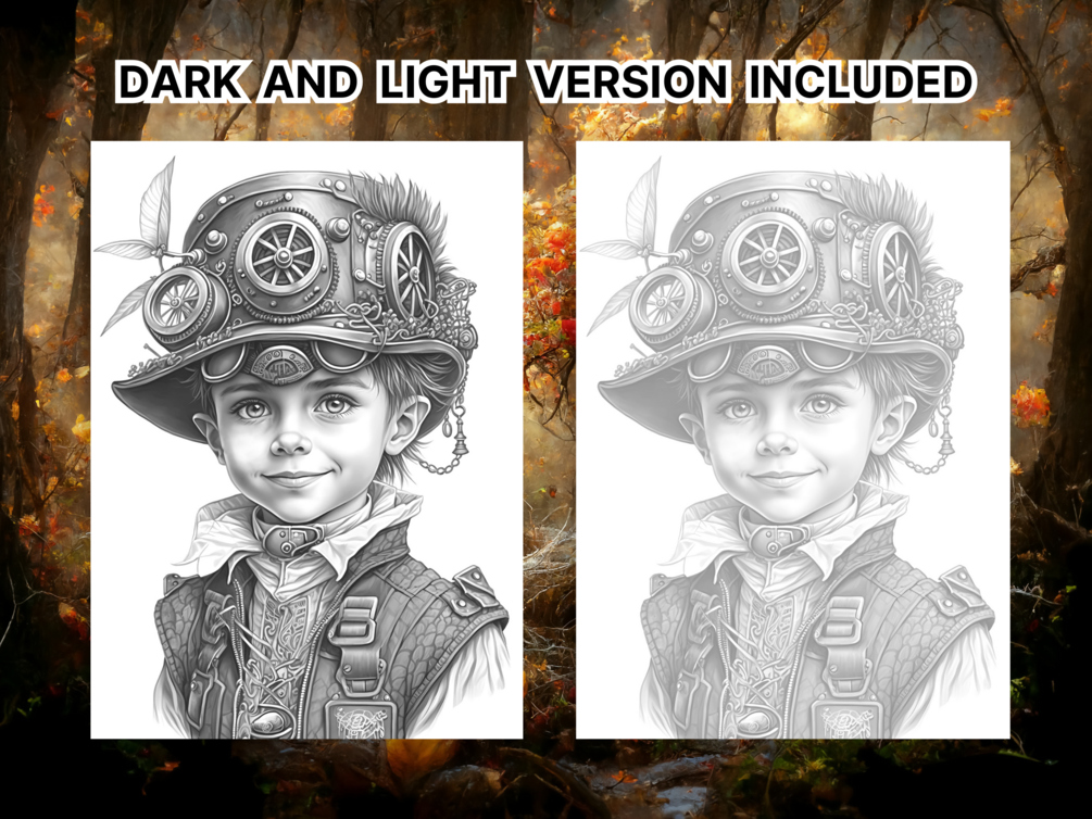 • 1 PDF with 25 full grayscale steampunk boy pages