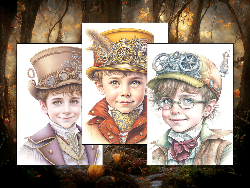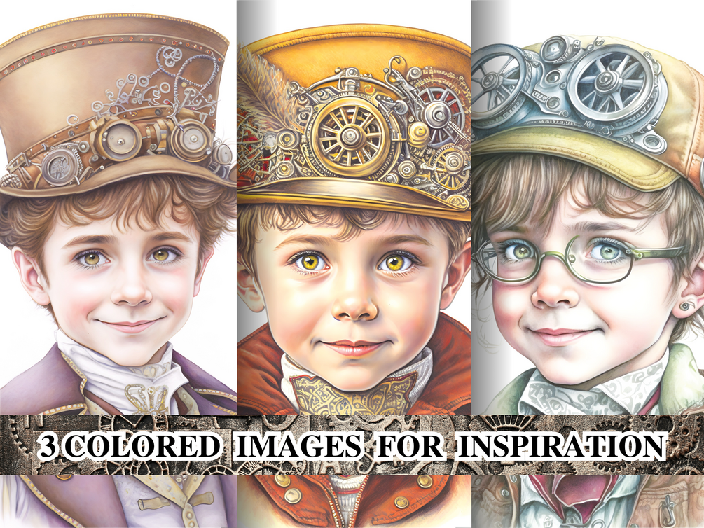 🎨 Bonus pages — 3 fully colored steampunk boys to inspire your palette and style
